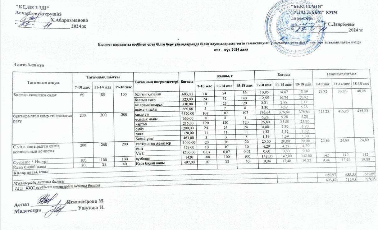 КҮНДЕЛІКТІ МЕНЮ/ ЕЖЕДНЕВНОЕ МЕНЮ » "№203 жалпы білім беретін мектеп" КММ