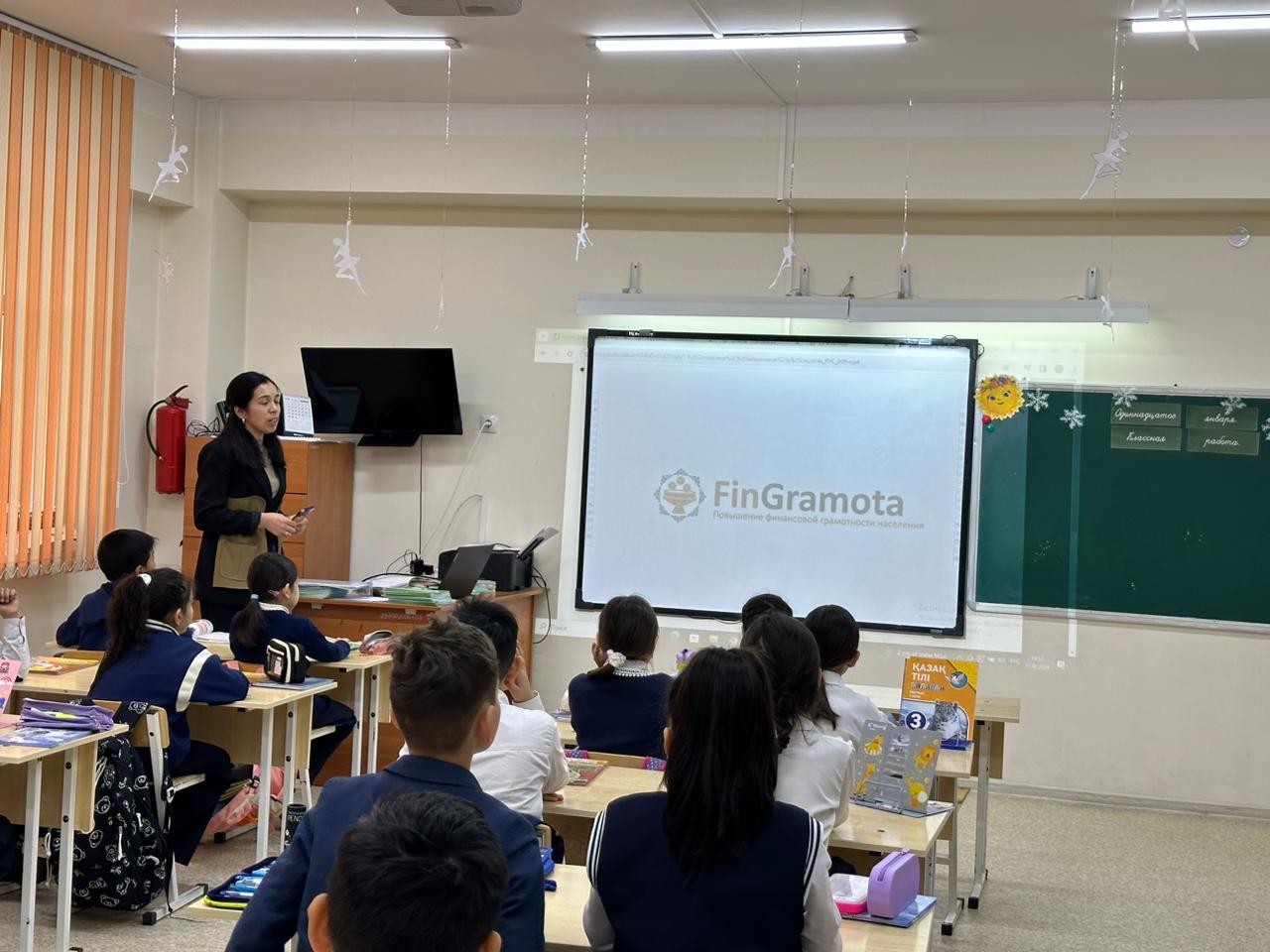 Оқу кабинеттерінде LED экраннан және интерактивті тақталардан қаржылық сауаттылыққа байланысты оқушыларға бейнероликтер көрсетіліп, дәрістер оқылды.