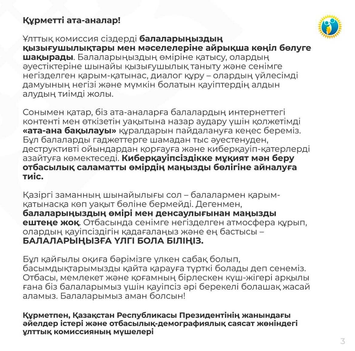 23 январь 2025 0 1 2 3 4 5 Ұлттық комиссияның ата-аналар қауымындастығына үндеуі / Обращение национальной комиссии к родительской общественности