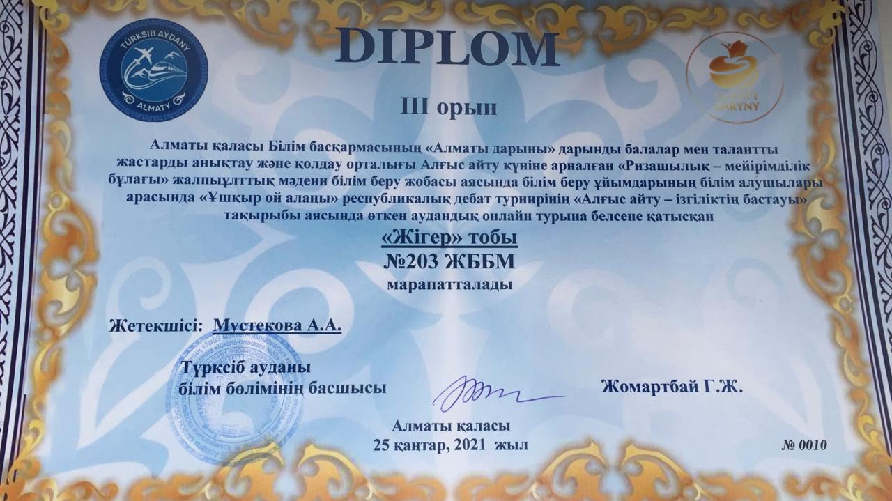 8-11 сыныптар аралығында өткен аудандық “Махамбет оқулары” байқауында 8 “А” сынып оқушысы Тұрсынбай Дария 1 орын, 11 “А” сынып оқушысы Сабиханова Қарақат 3 орын иленді. Жетекшісі: Алпысбай Мөлдір Алтайқызы. Ученица 8 «А» класса Турсынбай Дарья заняла 1 место, Сабиханова Каракат, ученица 11 «А» класса, заняла 3 место в районном конкурсе «Чтения Махамбета », проходившем среди учеников 8- 11 классов. Классный руководитель: Алпысбай Молдир Алтаевна.