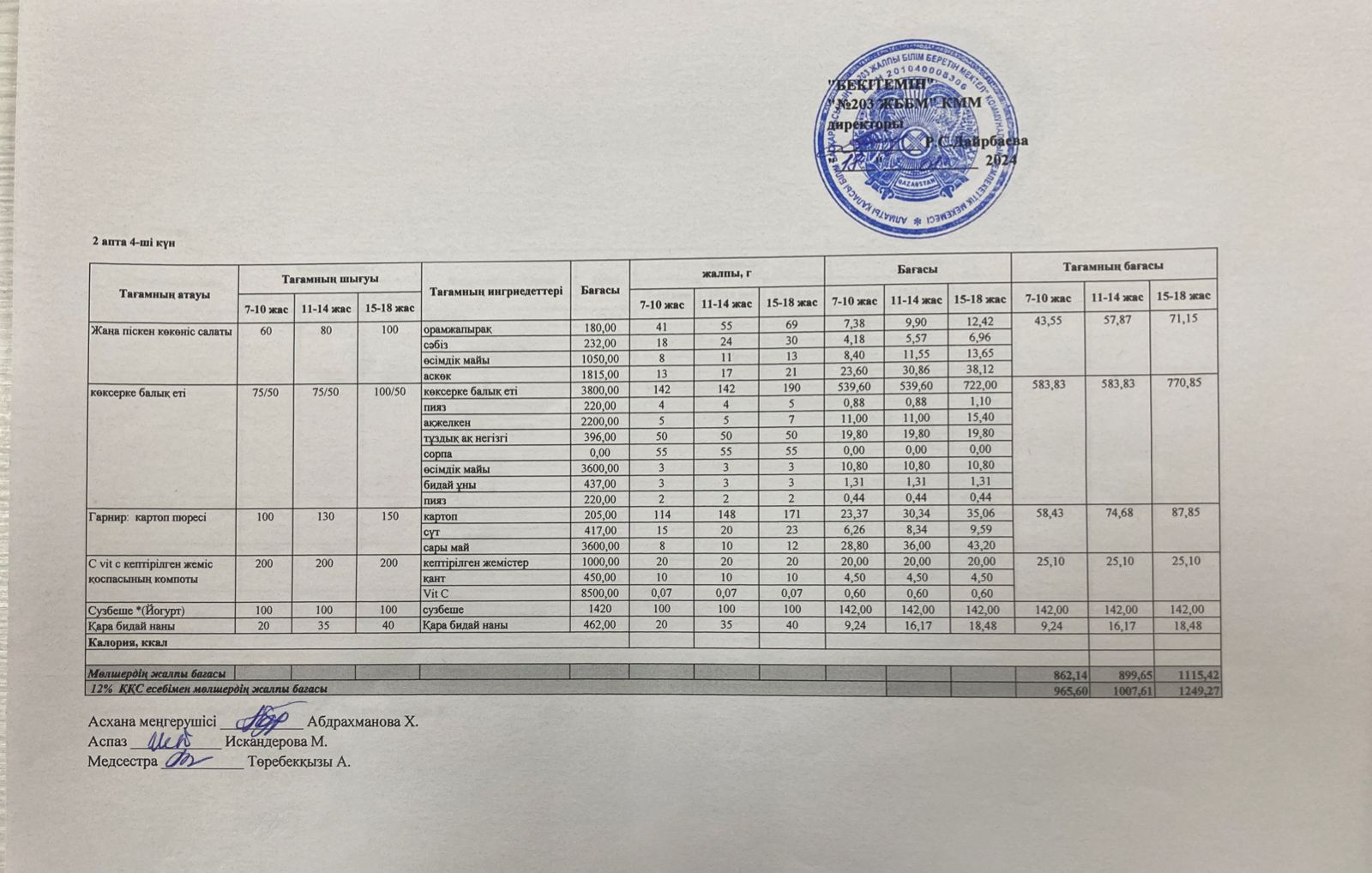 Күнделікті мәзір/Ежедневное меню » "№203 жалпы білім беретін мектеп" КММ