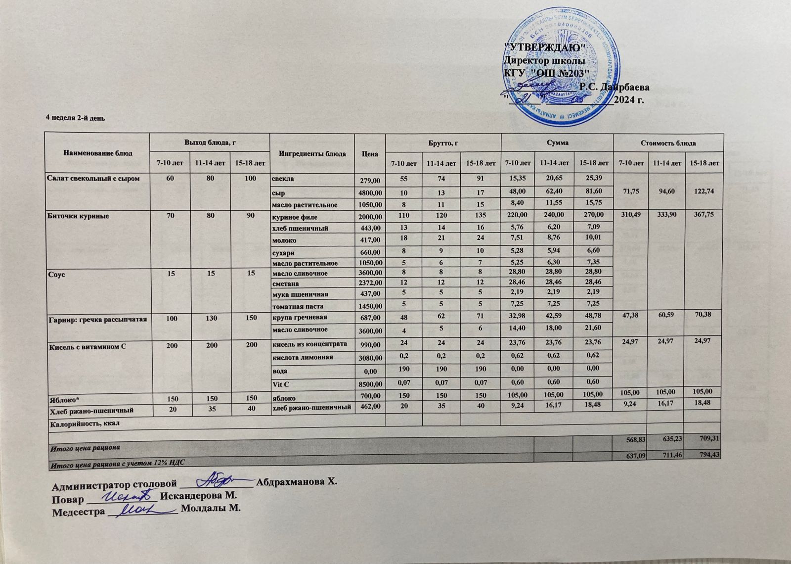 КҮНДЕЛІКТІ МӘЗІР / ЕЖЕДНЕВНОЕ МЕНЮ » "№203 жалпы білім беретін мектеп" КММ