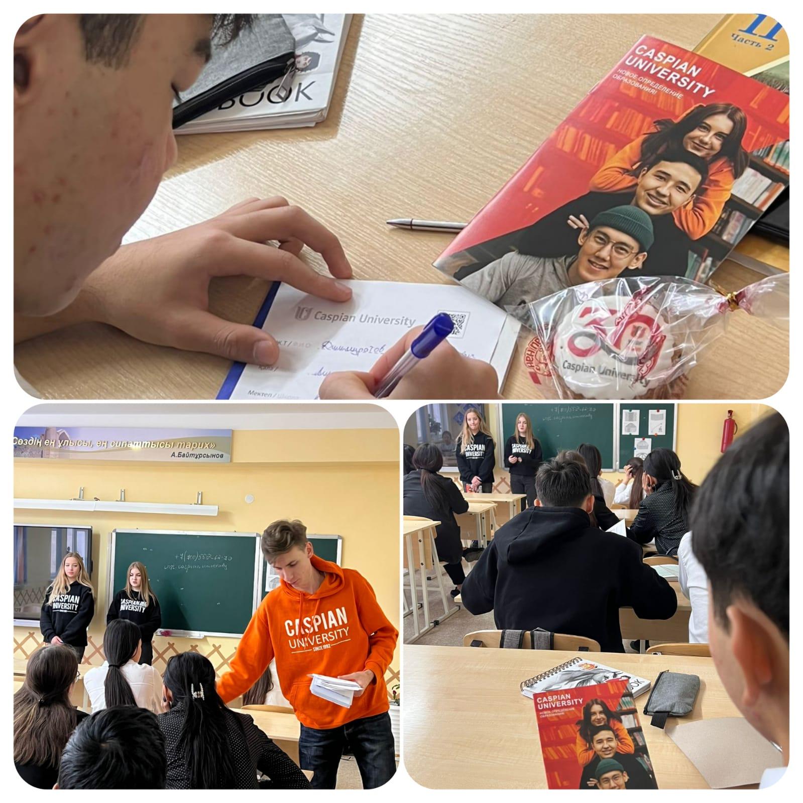 Біздің мектепке Каспий Университетінің өкілдері келіп ,университет жайлы мәліметтер айтып кетті.Оқушыларға ақпараттық қағаздар таратылды.