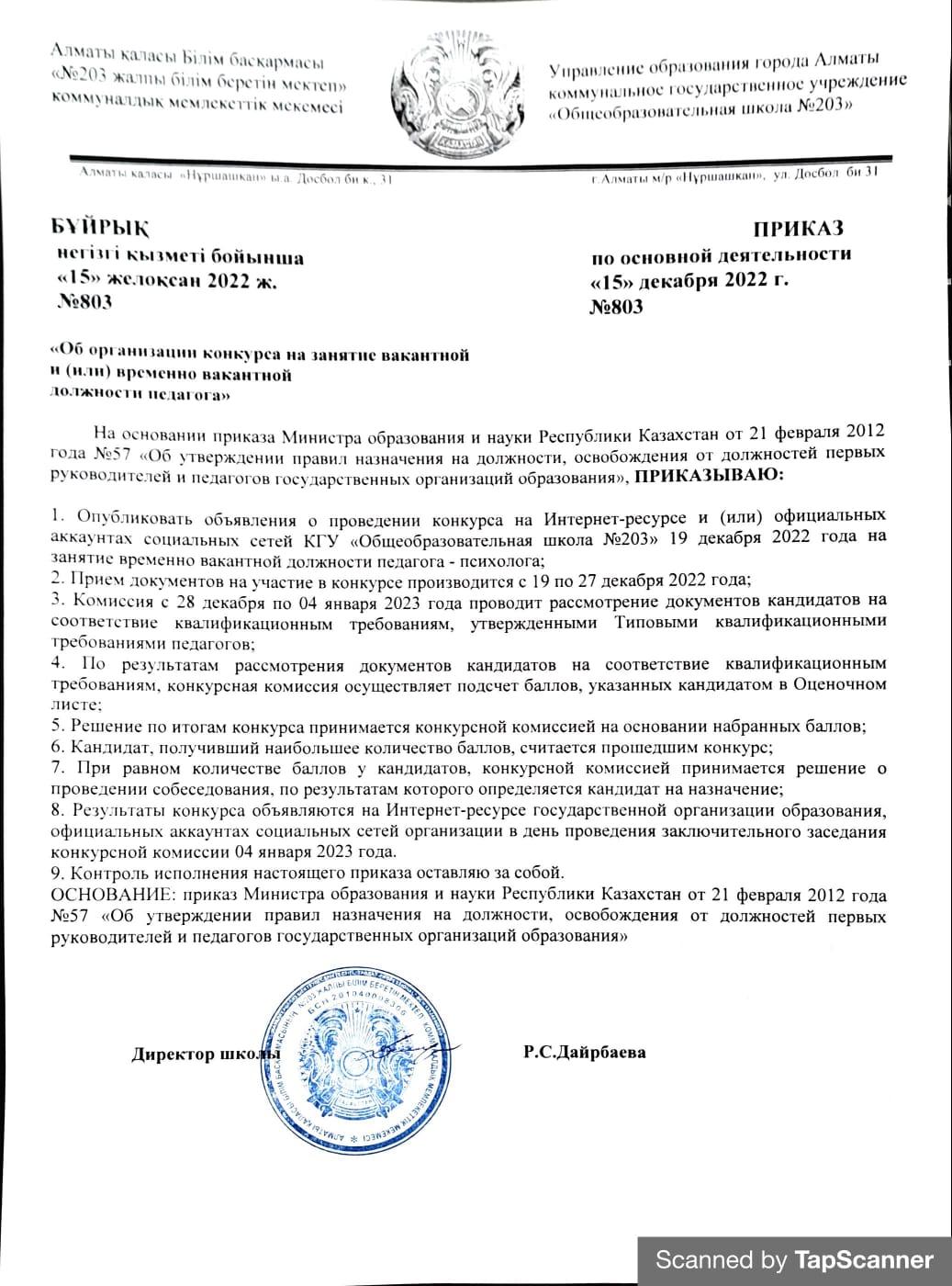 Объявляем конкурс на вакансию педагога-психолога » "№203 жалпы білім беретін мектеп" КММ