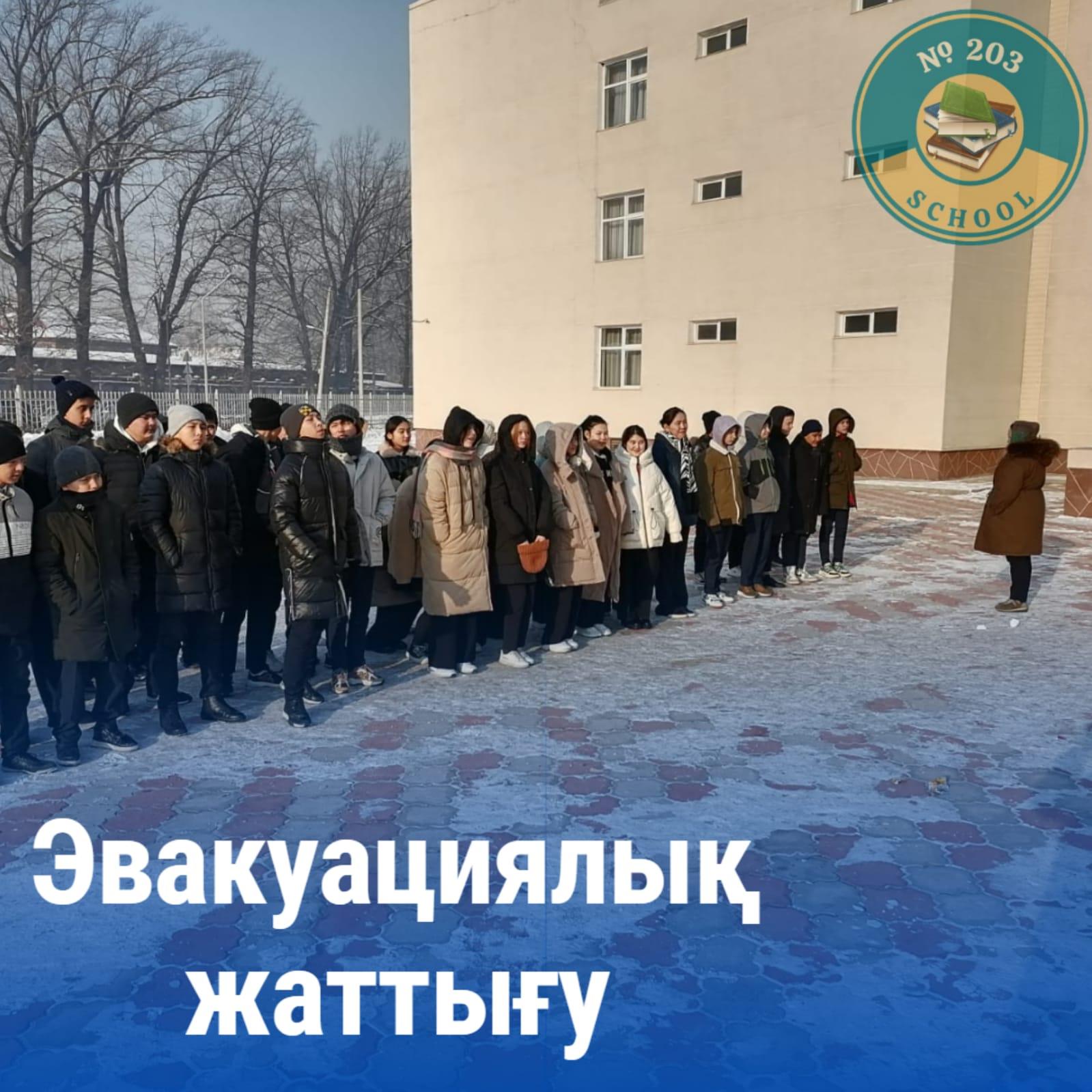 19.01.2023ж сағат 10:00 де азаматтық қорғаныс жоспары бойынша (жер сілкінісі ,өрт қауіпсіздігі бойынша ) эвакуациялық жаттығулар жургізілді.№203 Жалпы білім беретін мектептің білім алушылары төтенше жағдай кезіндегі ережені сақтай отырып жаттығуға белсене қатысты.