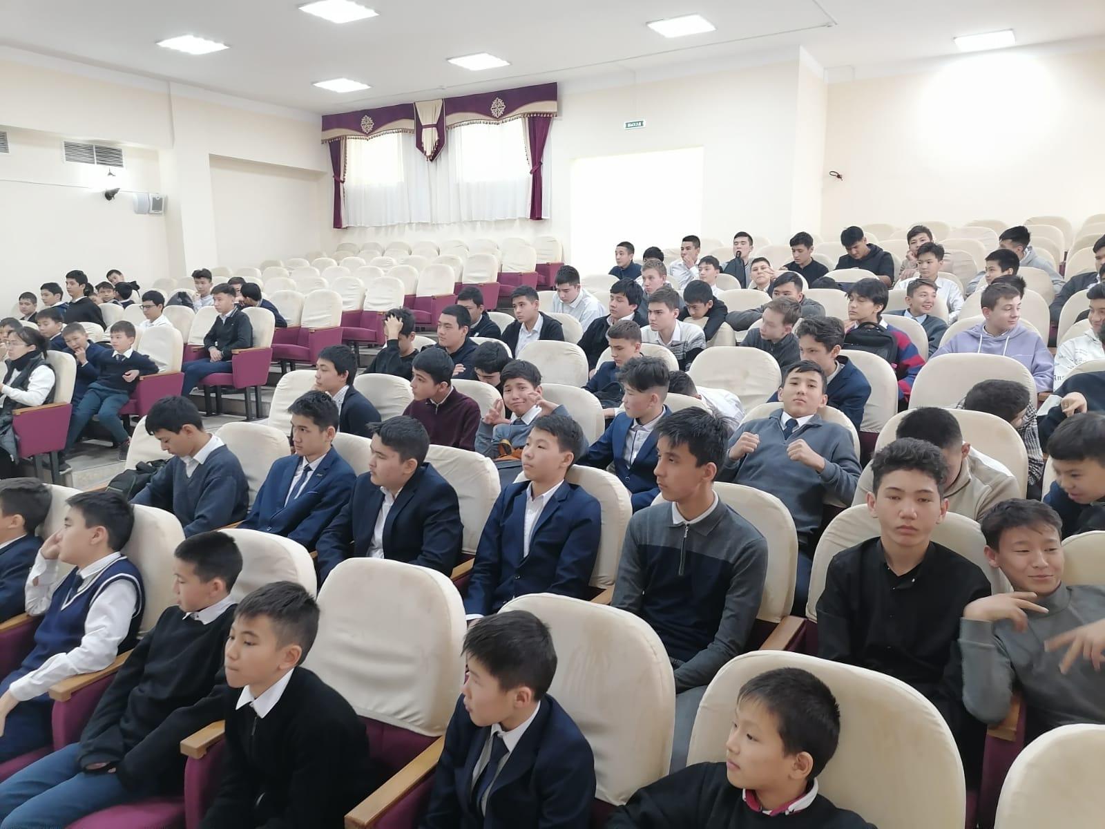 №203 ЖББ мектепте директордын тәрбие ісі жөніндегі орынбасары Исатаева А.С мен Алғашқы әскери дайындық пәні мұғалімі Айтжан Ә.С ұйымдастыруымен және Турксіб ауданының полиция басқармасының ЮПБ ЖКПБ ның камелет жасқа толмаған істері жөніндегі учаскелік инспектор полиция капитаны Нусипов Д.К, Лейтенант Кулмуратов Н.Т қатысуымен 8-11 сыныптар арасын да "Ұлттық тәрбие ұлағат көзі" тақырыбында ұлдар жиналысы өтті.