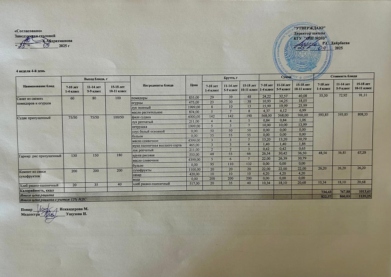КҮНДЕЛІКТІ МЕНЮ/ ЕЖЕДНЕВНОЕ МЕНЮ » "№203 жалпы білім беретін мектеп" КММ