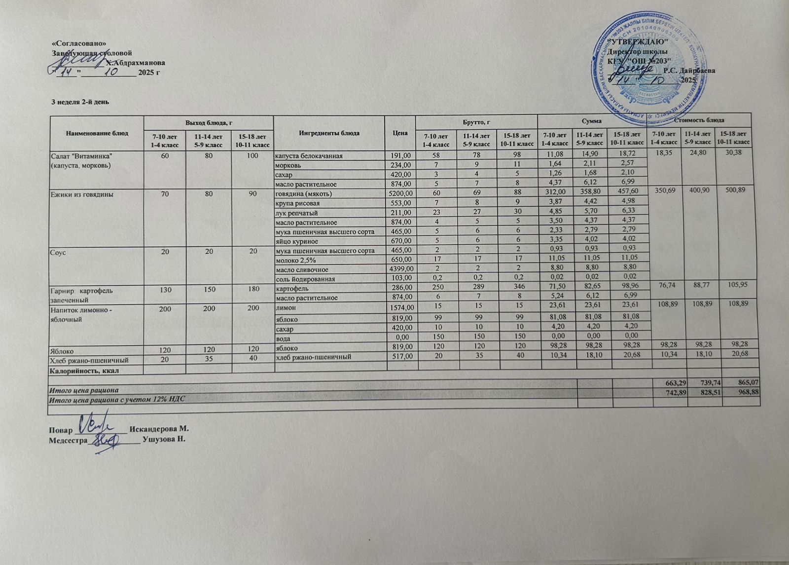 КҮНДЕЛІКТІ МЕНЮ/ ЕЖЕДНЕВНОЕ МЕНЮ » "№203 жалпы білім беретін мектеп" КММ