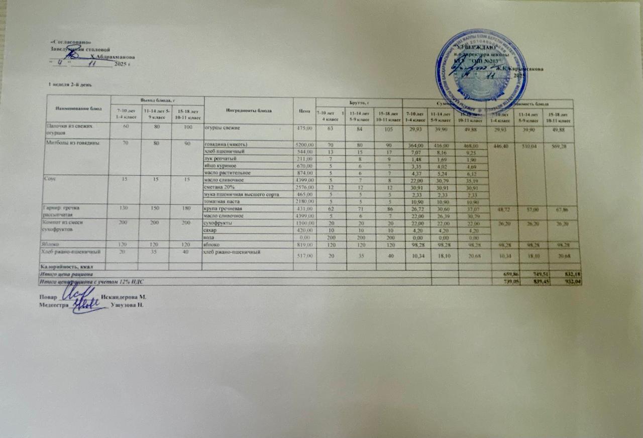 КҮНДЕЛІКТІ МЕНЮ/ ЕЖЕДНЕВНОЕ МЕНЮ » "№203 жалпы білім беретін мектеп" КММ