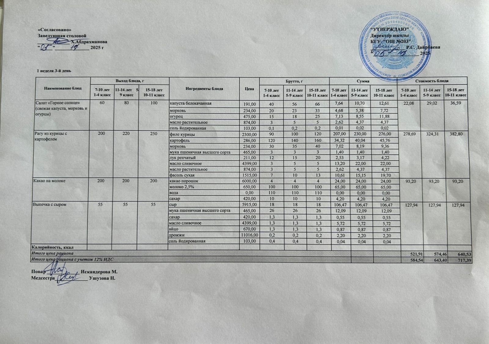КҮНДЕЛІКТІ МЕНЮ/ ЕЖЕДНЕВНОЕ МЕНЮ » "№203 жалпы білім беретін мектеп" КММ