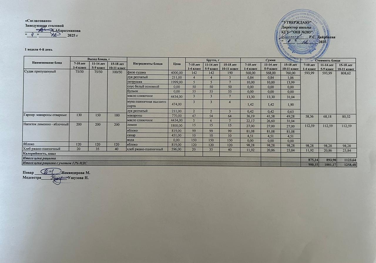 КҮНДЕЛІКТІ МЕНЮ/ ЕЖЕДНЕВНОЕ МЕНЮ » "№203 жалпы білім беретін мектеп" КММ