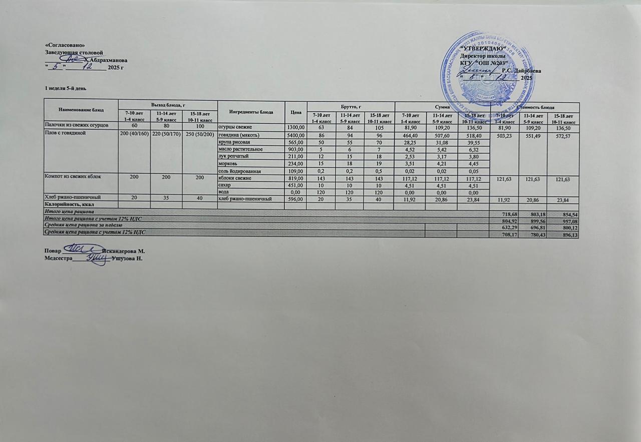 КҮНДЕЛІКТІ МЕНЮ/ ЕЖЕДНЕВНОЕ МЕНЮ » "№203 жалпы білім беретін мектеп" КММ